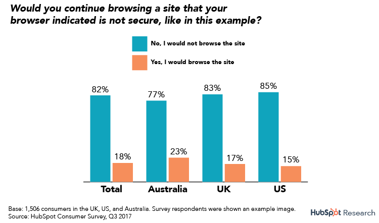 Because Chrome has 47% of market share, this change is likely noticed by millions of people using Chrome. And get this: 82% of respondents to a recent consumer survey said they would leave a site that is not secure, according to HubSpot Research.